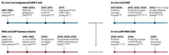 同样,基于靶向递送技术的开发与完善,mRNA体内CAR-T疗法的有效性在非肿瘤领域也得到了初步验证,如FAP-CARmRNA治疗心肌损伤、uPAR-CARcircRNA改善细胞衰老等。
